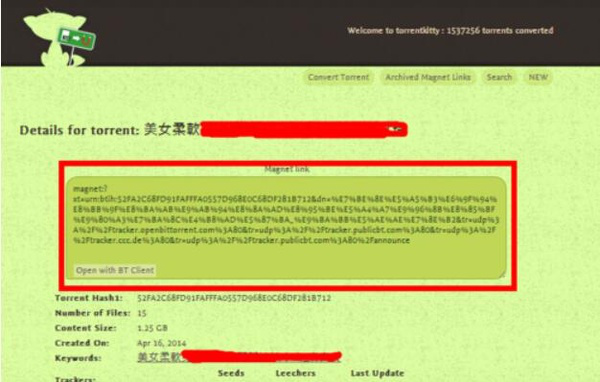 在“详细页面”中就可以得到种子的磁力下载地址,最后利用其它具有磁力下载功能的软件实现视频的下载操作。