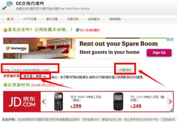 然后在打开的代理界面中,输入torrentkitty的官方网站,选择相应的“代理服务器”,然后点击“代理浏览”按钮。