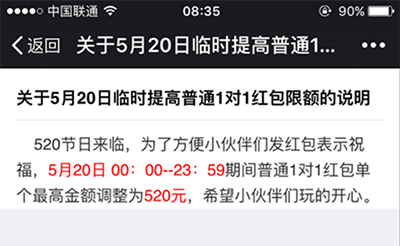 据微信红包发布公的“关于5月20日临时提高普通1对1红包限额说明”公告称,“5.20”节日来临,为了方便小伙伴们发红包祝福,5月20日0:00分—23:59分期间普通1对1红包单个最高金额调整为520元。据媒体报道,去年的5月20日,微信运营方也曾将微信红包的上限由200元调至800元,以满足发送“ 520元红包”需求。