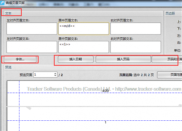 4、接下来就可以在编辑页面页脚界面对页眉页脚进行编辑了。这里可以在文本框里插入文字,所插入的字体可以点击“字体”进行修改。或者可以选择插入日期、页码等常用的页眉页脚。