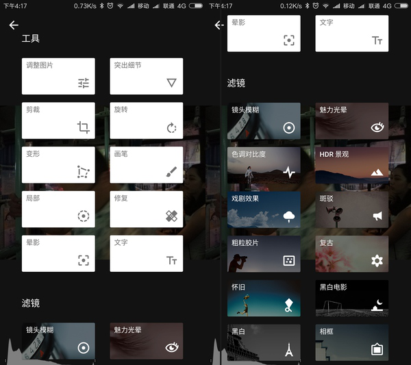 Snapseed的界面简单,功能分两类:工具和滤镜。