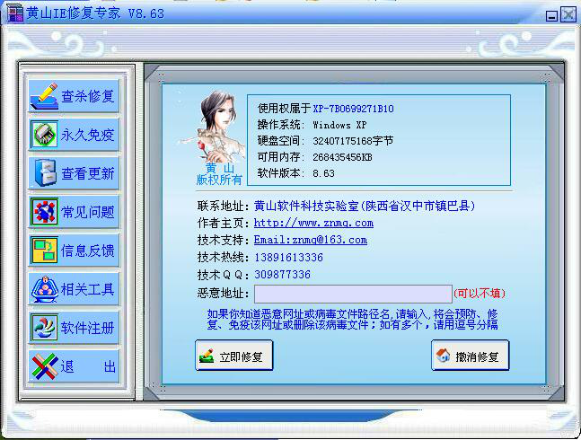 黄山IE修复专家是一款使用效果很不错的国产网络安全修复软件之一,主要应用于电脑IE被恶意网页破坏的,清除QQ自动发送信息病毒、黑客、蠕虫、木马病毒,进行系统优化,以达到永久修复的作用。同时具备IE修复、杀QQ病毒杀各种以服务方式运行的病毒、杀各类木马(无进程木马、插入线程木马)、清除各种间谍广告程序、各种流行病毒及系统救援与日志上报于一身,一套等于多套。