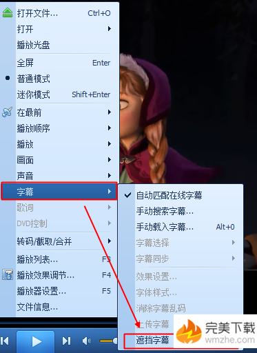然后在主界面,单击鼠标右键,在下拉菜单中选择“字幕”-----> “遮挡字幕”