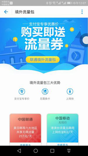 支付宝的服务功能给我们的日常生活带来了极大的便利,包括出境中的很多事项都能完成。经常往返港澳台三地的小伙伴想必都知道,联通和移动用户可在出发前用支付宝直接按天购买流量包,到达后不用换卡或携带Wi-Fi设备,直接手机上网。