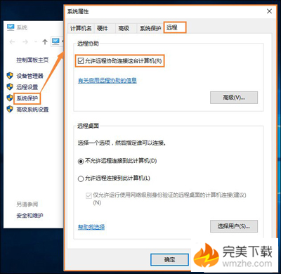 1、右键此电脑选择属性,在点击系统保护 -》 远程-》 允许远程桌面;