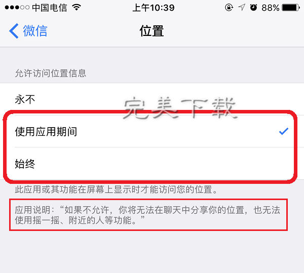 4、将位置设置成【使用应用期间】或者【始终】即可,可以看到官方说明(了解更多微信相关资讯,访问www.gxdongfangshi.com(东方狮教程))。