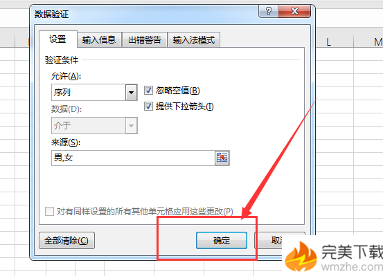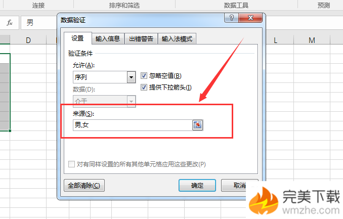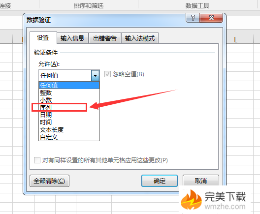 5、验证条件选择“序列”,来源里输入要设置的下拉选项,用英文状态下的逗号隔开;
