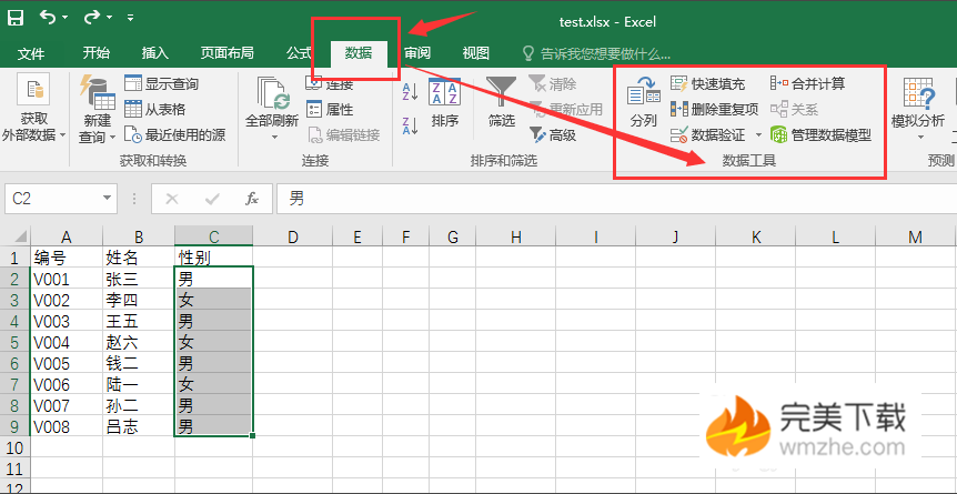 2、在Excel表的菜单选项中找到“数据”,数据菜单下方的工具栏中找到“数据工具”板块;