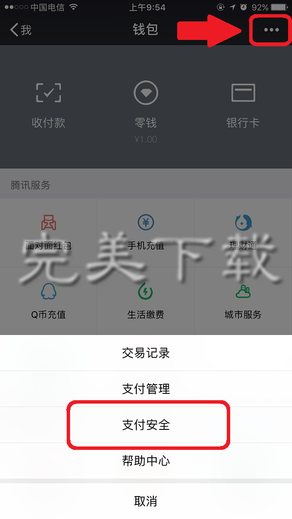 2、点击右上角的【···】标志,点击打开【支付安全】;