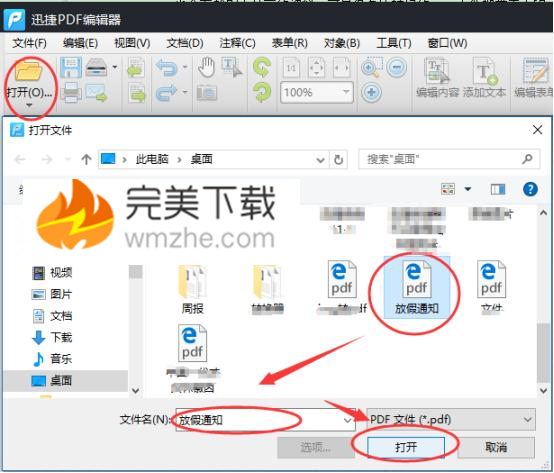 1、双击打开迅捷PDF编辑器,然后我们就可以使用这款编辑器对PDF的水印进行添加或删除了,请看下面操作,点击“打开”,将电脑上的PDF文件添加到编辑器程序界面,进行编辑。