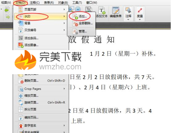 2、PDF文件打开后,我们点击“文档”,可以看到“水印”的选项,我先给大家示范一下添加水印,所以点击“添加”就可以了。