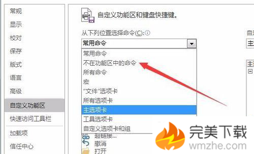 这时右侧窗口中会打开自定义功能区页面,在“从下列位置选择命令”下拉菜单中选择“不在功能区中的命令”菜单项