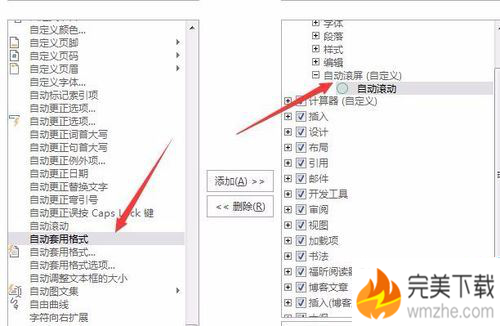 接下来在“不在功能区中的命令”窗口中向下拖动滚动条,找到“自动滚动”命令,同时右侧新建一个选项卡,名字(了解更多word相关资讯,访问www.gxdongfangshi.com(东方狮教程))可以自己随意起一个,然后把“自动滚动”添加到该选项卡中即可