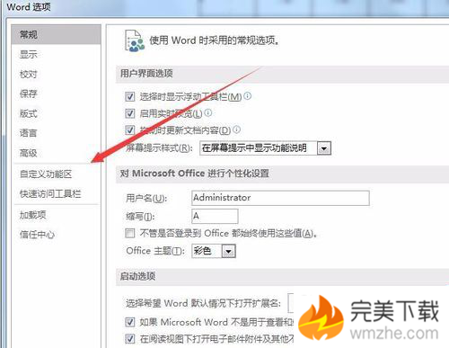 这时会打开Word选项窗口,在这里点击左侧边栏的“自定义功能区”菜单
