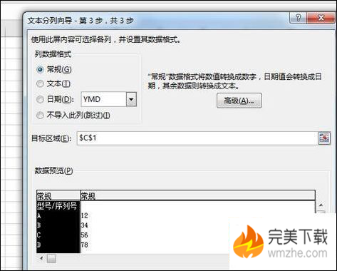 在弹出的对话框中,出现“文本分列向导第二步”对话框,选择如图中所示的,“TAB”键其它“-”对话框下部也可以时实预览分列的情况,点击下一步,会出现“文本分列向导第三步”,按图中所示的设置,“常规”目标区域和预览来设置,点击“完成”,如下图所示。