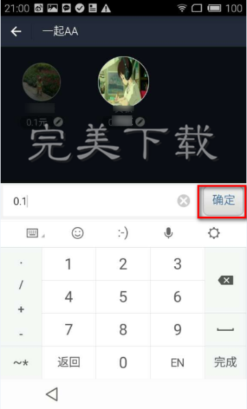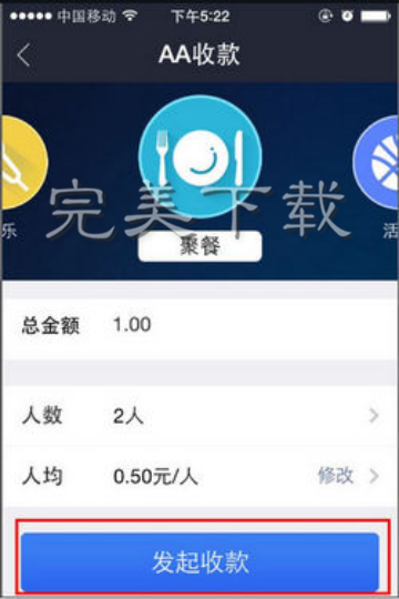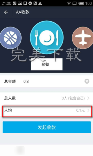 9、填写完金额提交后,自动计算人均金额并更新显示在每个收款对象上(收款人可以修改单个对象的收款金额,修改金额保留小数点后两位,必须大于等待0.01),确认对象和金额后提交,创建AA收款成功,系统通知被收款方;