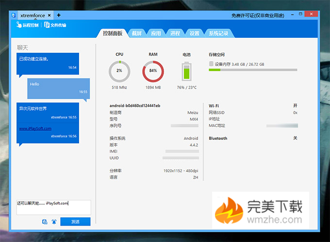 点击左上角的「远程控制」可以远程操控 Android 手机,并实时看到手机的画面,操作也非常方便!实际测试,远程连接的速度虽然有一定的延时,但体验上感觉还可以接受的。一般情况下,帮家长、妹子排除手机疑难杂症,安装或设置个软件什么的完全没有问题。