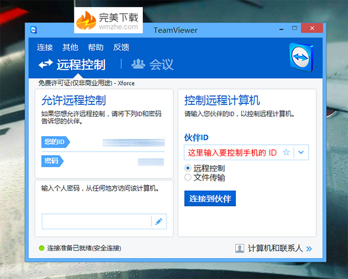 接下来你就可以从电脑端输入这个ID来连接你的移动设备了(如下图),连接成功后会手机便会登入到上图右(了解更多远程控制软件,访问www.gxdongfangshi.com(东方狮教程))的界面。得益于 Teamviewer 强大方便的远程连接技术,你并不需要关心公网 IP 地址、端口、防火墙这些乱七八糟的东西,完全不需任何设置。