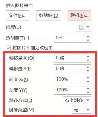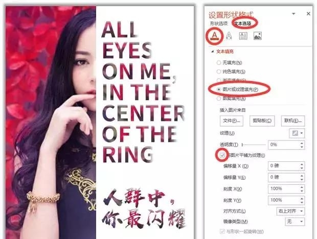 将文字填充设置为图片填充。使用同一张图片对文字进行图片填充,并勾选【将图片填充为纹理】。