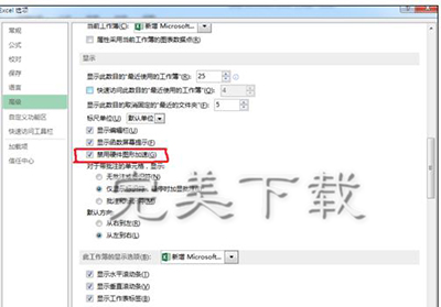 步骤4:在选项框中找到“禁用图形硬件加速”,单击在(了解更多excel教程资讯,访问www.gxdongfangshi.com(东方狮教程))这个选项前面的方框。如下图: