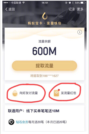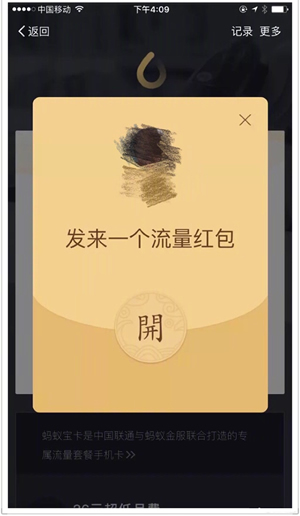 如果你是非联通用户,也能收到流量红包,不过需要办理了蚂蚁宝卡后方可提取流量,当然也可选择转赠给联通好友。