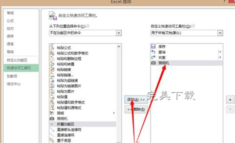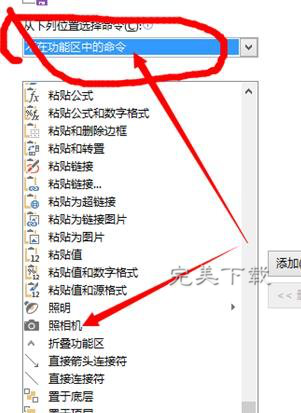 在左边选择不在功能区中的命令,下拉可以看到照相机