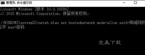弹出如图命令框,在里面直接输入netsh wlan set hostednetwork mode=allow ssid=局域网的名字 key=密码