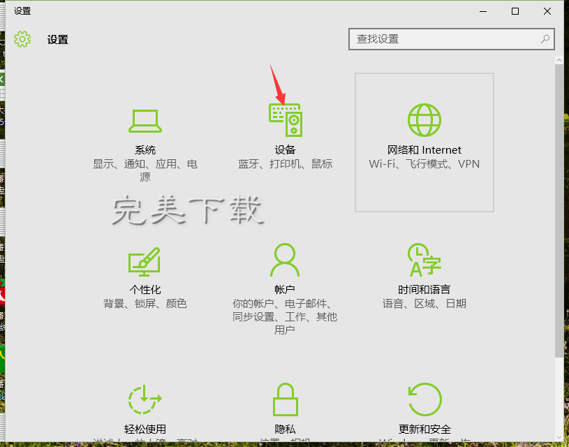 1、按Win+i打开设置窗口,点击其中的“设备”选项;