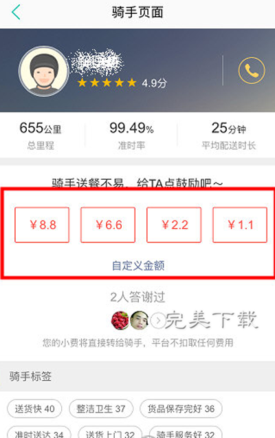 2、点击【答谢骑手】,可以对骑手进行打赏服务,金额有1.1元、8.8元不等,也可以自定义金额。