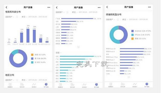 支持查看小程序新增或活跃用户的性别、年龄、地区、设备分布,开发者可以在后台或者小程序数据助手清晰地了解到每个用户的“用户画像”,更好地分析小程序数据,在此基础上做更精准的决策。(数据每天早上更新)