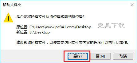4、之后将新路径选择为:D\\Desktop ,完成后点击下的“确定”,之后会看到一个“是否要将所要文件从原来位置移动到新位置”的提示,直接点击“是”就可以了,如下图所示。