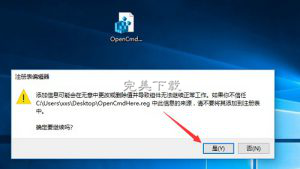 5、回到系统桌面,左键双击“OpenCmdHere.reg”注册表文件图标,这时会弹出一个编辑器对话框,点击“是”;