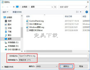 4、在打开的另存为窗口,先点击窗口左侧的“桌面”,然后在在文件名(N)栏中输入“OpenCmdHere.reg”,再点击“保存”;