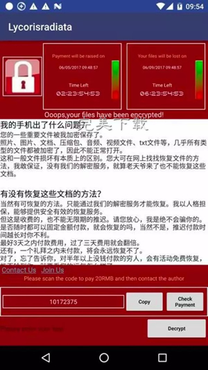 从已经遭遇勒索病毒攻击的用户反映看,该勒索软件在界面上,高仿电脑版的“永恒之蓝”勒索病毒,功能和电脑版一致。