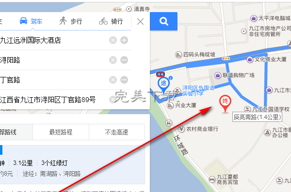 3、选好目的地按回车以后,规划的路线就生成了,这条路线是软件考虑了时间、距离和交通状况以后规划的最优路线。你可以看到走这条路线需要的时间和路程。