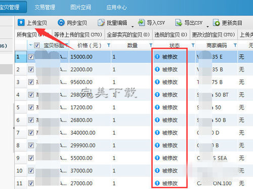 保存后,这里显示的是被修改状态,就是宝贝详情被修改过。然后点击上传宝贝,就可以把修改好的内容上传到淘宝更新状态了。