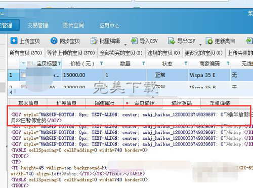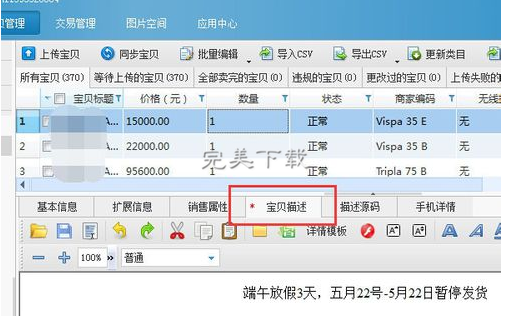 3、之后随意选择一个产品,在宝贝描述这里添加上你要批量添加的内容,比如端午节放假几天不发货的公告,你也可以添加其他的内容,比如活动横幅等。