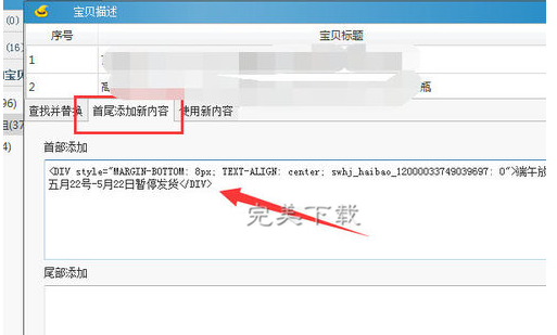 6、进入编辑宝贝描述后,选择“首尾添加新内容”,把刚刚复制好的代码粘帖到这里,这里只可以粘帖文字,所以添加图片等内容只能先获取代码,然后添加。如果只是添加文字,可以忽略获取代码的步骤。