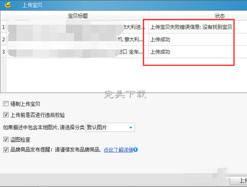 上传后,这里如果成功就会显示上传成功,如果不成功,会提示是什么问题,然后按照提示修改一下就可以了。通常宝贝详情内容填齐全都不会有问题,这里不成功的只是小编故意删了一个宝贝作为不成功的演示案例。淘宝助理批量添加宝贝描述就完成了。