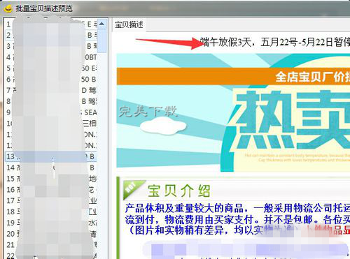 添加后按预览按钮,先预览一下,预览页面左侧是宝贝,右侧是描述。随便点击一些左边的宝贝,看看右边的描述有没有已经添加成功。成功了就可以保存了。