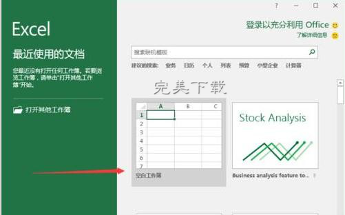 1、在计算机桌面上的Excel2016程序图标双击鼠标左键,将其打开运行。并点击“空白文档”选项,新建一个空白Excel文件。如图所示
