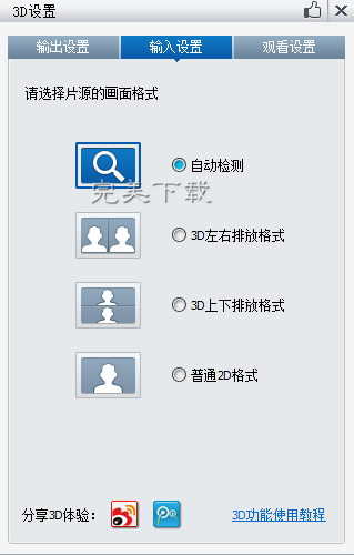 同时您也可以自主设置输入格式,暴风可以做到你无论输入的是真3D片源(包括上下、左右格式)还是普通的2D片源,暴风都可以为你提供酷炫的3D体验;当然暴风还有一个绝技就是可以自动为你检测片源,而且暴风的检测率高达100%哦,暴风默认会为你提供自动检测。