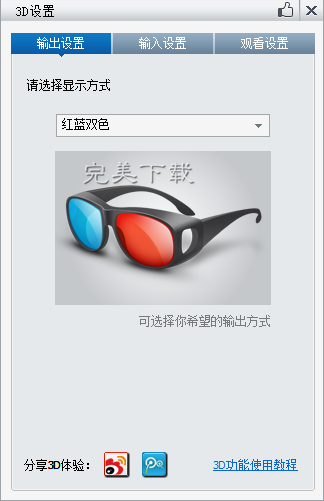 你可以选择输出方式哦,我们默认提供“红蓝双色”显示,如果不做更改,你要带红蓝眼睛体验3D哦,如果你没有红蓝眼镜,你也可以自己制作哦。