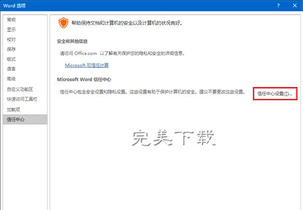 4、在左侧列表中选择最后一项“信任中心”,然后点击“信任中心设置”,如下图
