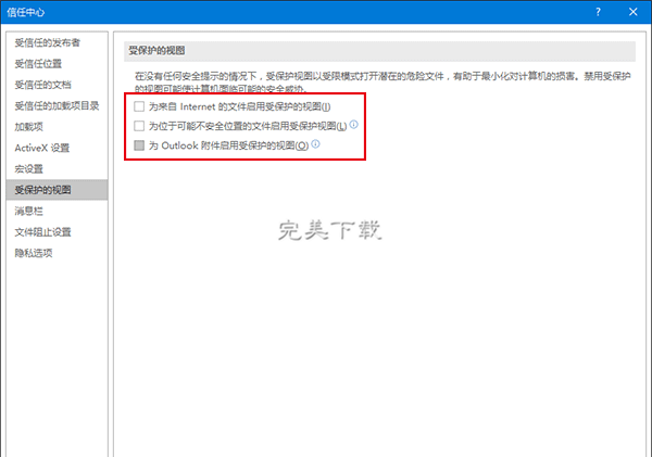 5、在左侧列表中选择“受保护的视图”,然后取消勾选右侧三个选项后,点击“确定”,如下图
