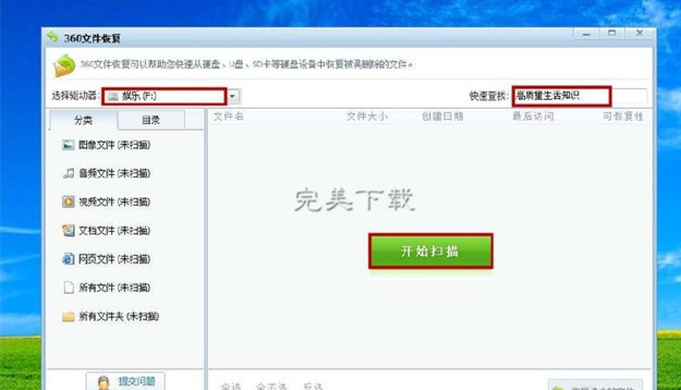 打开的对话框中,选择你删掉文件所在的驱动器,后面也可以输入文件的名称,点击“开始扫描”