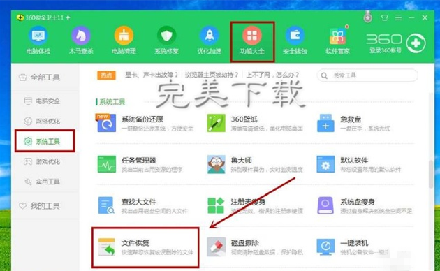 打开360安全卫士,选择“功能大全”→“系统工具”→“文件恢复”