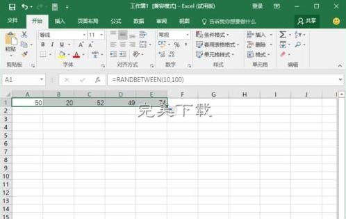 4、在A1单元格上向右拖动鼠标到E1单元,可以等到随机整数。
