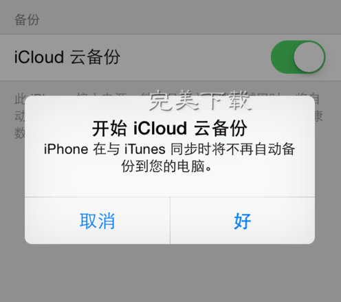 4、用户进行了向左拖拽勾选操作后,系统自动弹出“开始iCloud云备份”的询问框,如果确认自己可以接受的话就点击询问框上的“好”按钮吧。