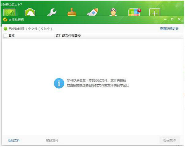360文件粉碎工具能对文件进行彻底粉碎和删除,360文件粉碎机采用360安全卫士独有的“破冰”技术,将顽固木马及恶意程序的防护摘除,强力并彻底删除木马及恶意程序的文件。